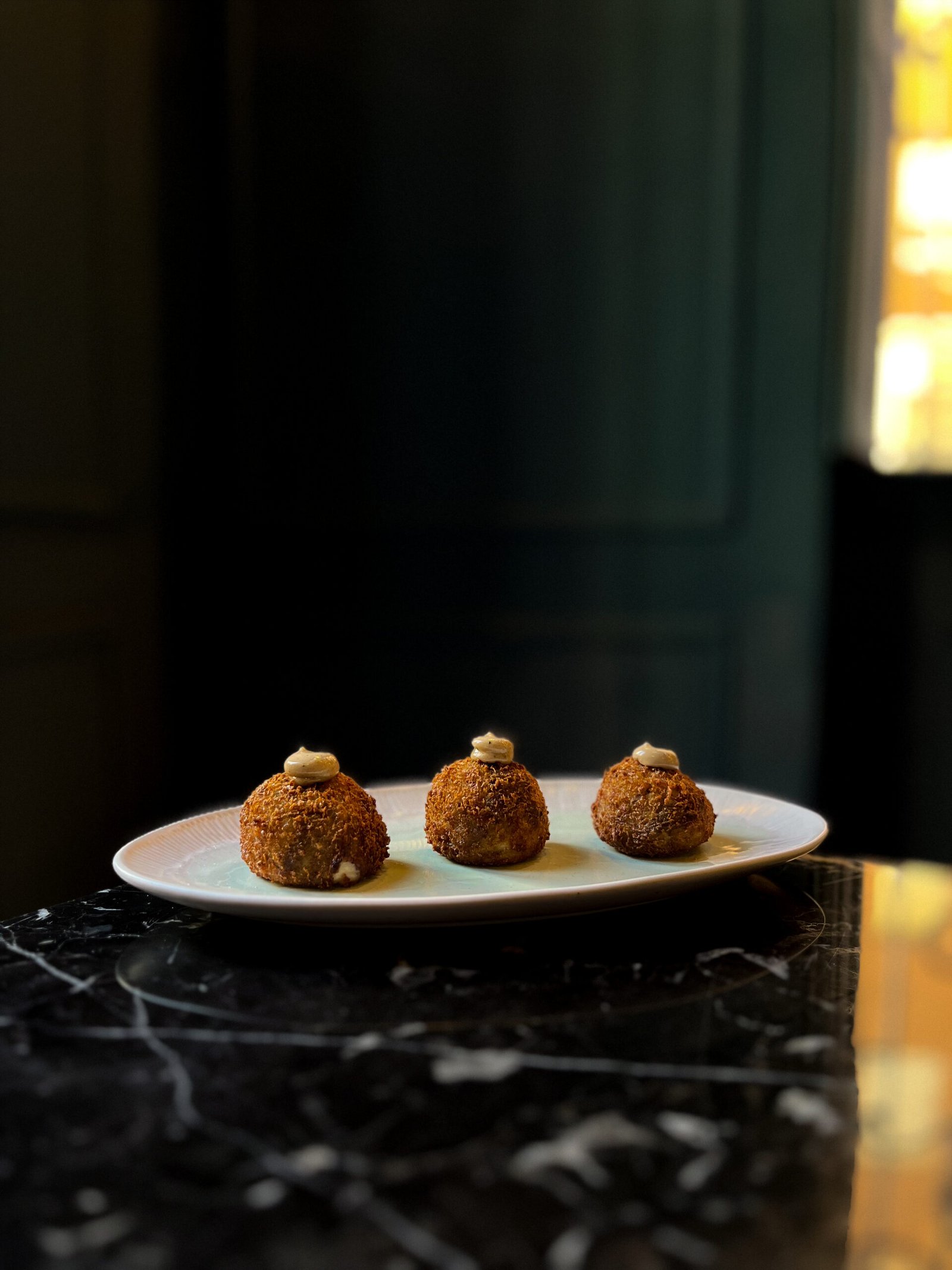 Mozzarella fior di latte, jamón al horno, setas pioppini, aceitunas taggiasche,crema de alcachofas y polvo de aceituna
